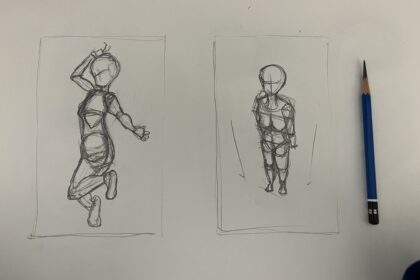 人体に直線はない。人間の全ての線は若干のカーブを持っているので、どの方向に線が曲がっているのか、どの方向にうねるのかを大きく意識して線を描くと自然な線が描けるようになる。そして直線よりも曲線で人体の流れや比率を意識して描くと、よりいきいきとしたクロッキーラインが描けるようになるだろう。コントラポストを省略しながら描くこともできる。外郭のライン、肩と骨盤の歪みをとりながら体の厚みと動性を合わせる。慣れたらこのような描き方ができるようになる。