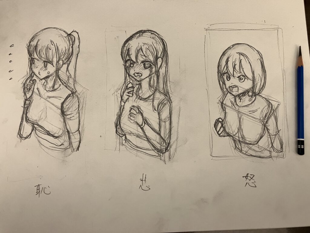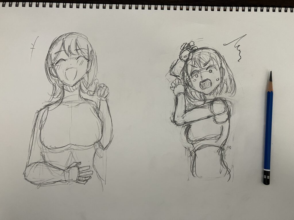 動画内でらんふ先生が描いていた5つの表情とポーズの練習。やっぱりハイアングルやローアングルが苦手だ。写真2枚目のハイアングルは時間がかかった。らんふ先生はハイアングルを描くのがめっちゃ上手い人なので、この技術を盗めるように頑張りたい。あと表情もお手本と比べると印象が弱い。多分らんふ先生はルーミス式?で描いているが、私はラッキ式なのでそこら辺を上手くすり合わせていけるように練習が必要だ。