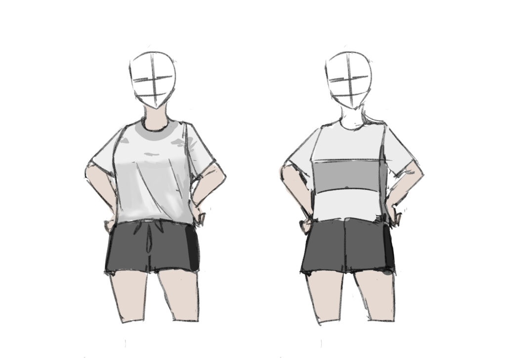 服の塗り。服の塗り方も面で捉えていこう。光源と反対側の側面には影が入る。胸の側面、胸のしたのブロックに影が落ちる。胸はトップスの頂点からひっぱりシワが生じる。袖も肩の頂点からシワが入る。シワは面が分かれる指標になる。つまりそこを起点として光が当たる具合が変化するということだ。シワの反対側は少し明るくなる。境界を意識した面割りを心がけて欲しい。