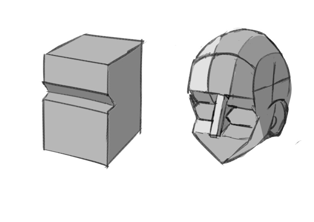それを踏まえてどの様に影を落とせば良いのか?キャラクターの顔に影を塗るとすると、キャラクターの頭を立方体で捉える感覚で影をつけていこう。目の下はくぼんでいるので光源が上にあると影ができる。おでこは3つのブロックに分けよう。おでこの端のブロックには影が入る。側面には影が落ちるし、眉の下にも影ができる。鼻筋の横にも影ができる。反対にハイライトは、おでこの反対側の端のブロック、鼻筋の上の面、頬だ。このように面を割って捉えていくと描きやすくなる。
