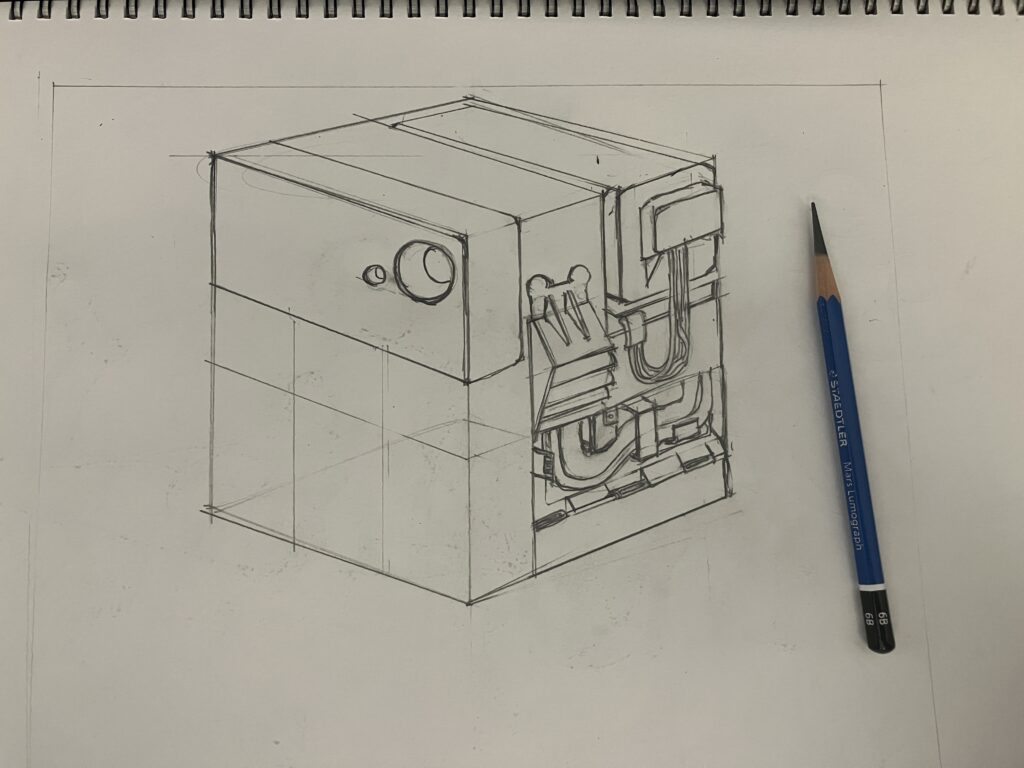 (前回の続き)エネルギー源となるものを描いてみたが、どちら側が前になるか考えていこう。電池は正面には来ないことが一般的なので手前側を裏側としよう。新たなディティールを付け加えてみよう。現実のメカには「分割点」というものが多く存在する。そこを開閉することで中をメンテナンスしたり、収納スペースになっていたり、電池を入れ替えたりできる。分割点を追加しながら機能を足していこう。排熱口、内部の熱を逃がす機構だ。ここでメカの内部構造を少しだけ見えるようにしたい。外装を外している描写にする。フレームのつなぎ目を追加。内部構造と言ってもフレームの一段階下、薄いケーブルが見える程度だ。メカ絵にとってのパッと見の複雑さは内部構造であってここが描いていて楽しい。今小さいビスを追加したが、このように小さい点だけでも全体の印象が変わる。常に画面全体を引いて確認しよう。今のままだと内部構造が少し弱い印象を受ける。線を増やして情報量を足していこう。メカの顔に映る。カメラを設置しよう。カメラは見ている人にも「カメラだ」と伝わりやすい。(次に続く)