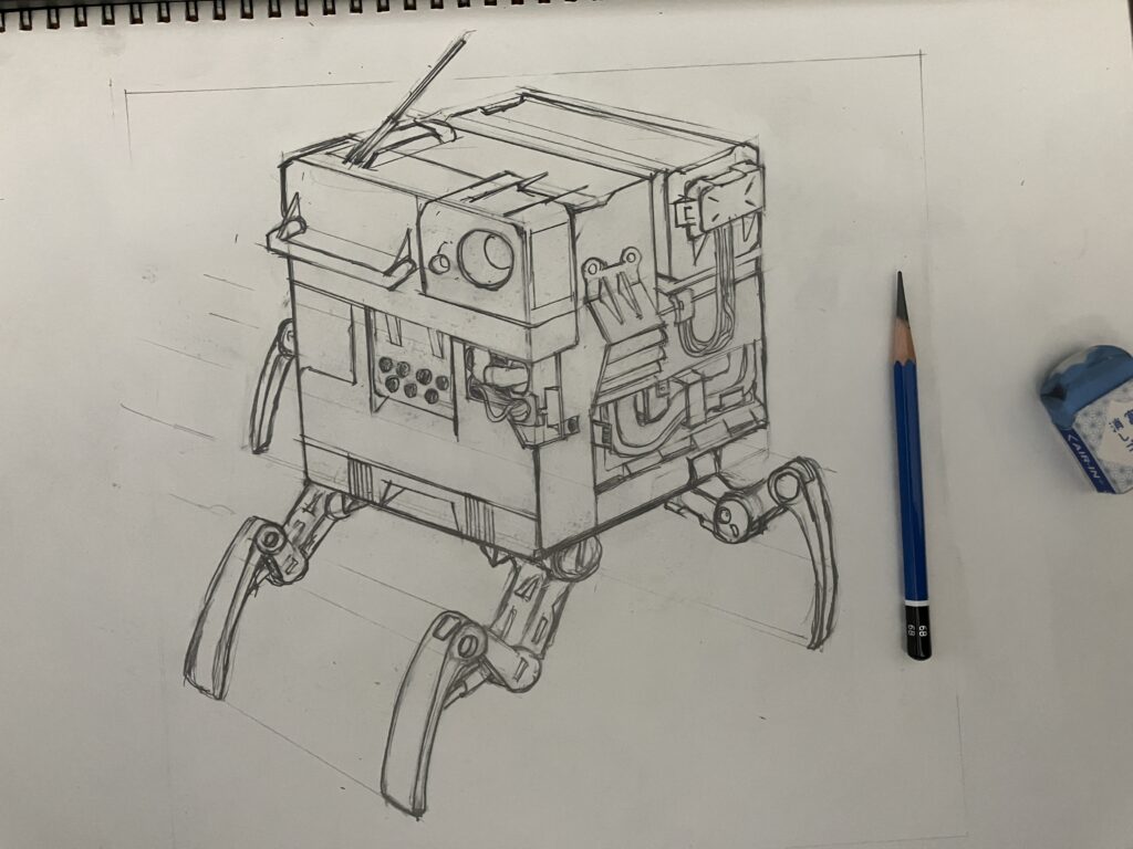 実演:脚を描く時は、付け根の関節から始めると良い。関節は構造上頑丈でなくてはならないので、貧相にならないように注意しよう。脚の裏にシリンダーを追加したが、これは人によって好みが分かれるパーツだ。シリンダーを外に出すことが構造上よろしく無い、原始的だという考えもある。外装を外した時に初めて見える部品でもあるのでそこは好きに描いてみよう。脚を下から生やすことのメリットは2つある。1つは生物学的に見慣れていること。違和感が無い。2つ目は負荷がかからないこと。全体の重さを支えることになるので横から脚を生やすためには相当頑丈でなければならない。