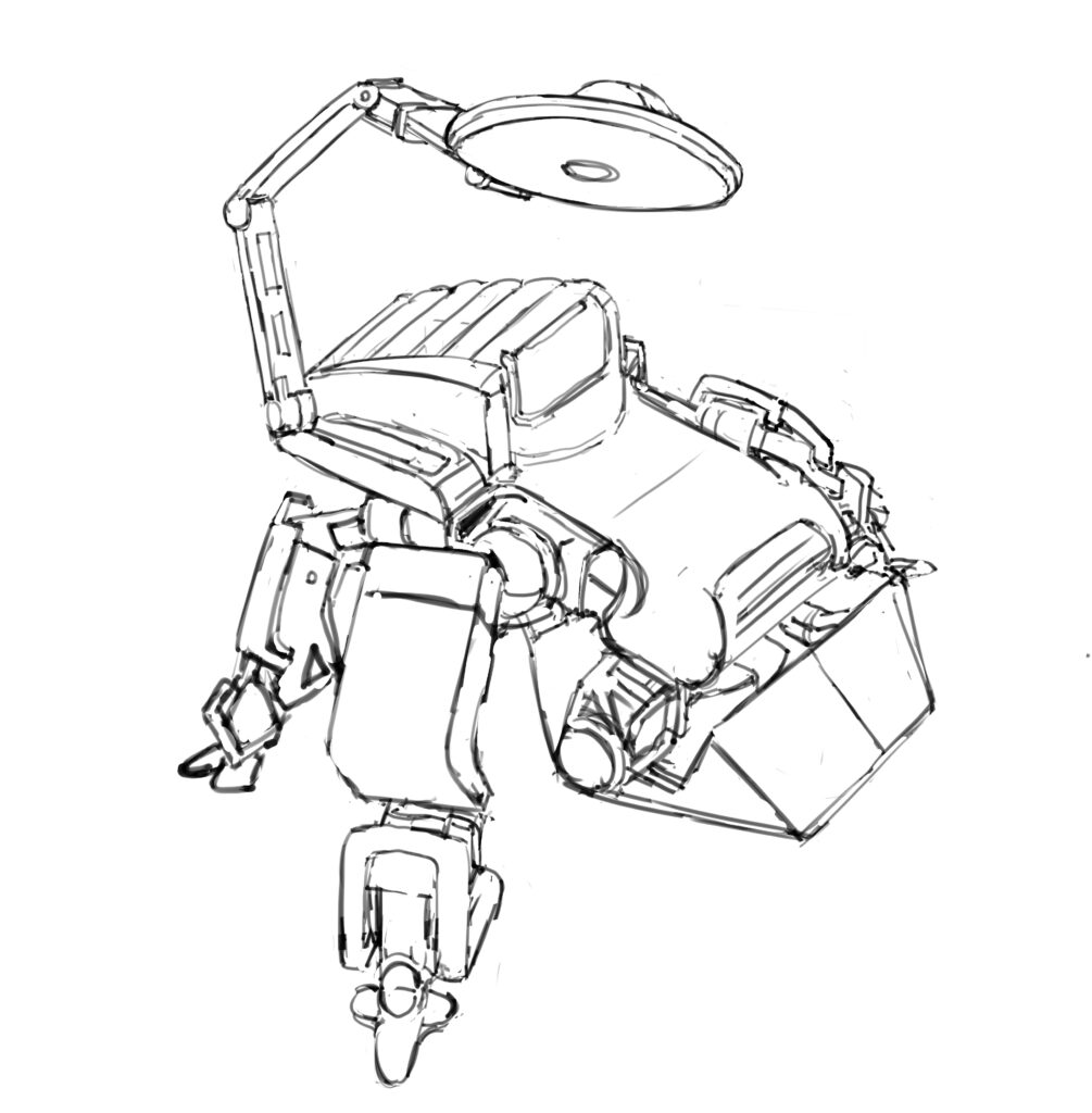 ここから線画。最初に入れる線が太くなりがちなので、個人的には前方から描くようにしている。ディティールに修正を加えつつ描いていく。頭の中で3Dの空間をイメージしよう。パースというのを極端に正確に描くと迫力が失われる。あくまで「絵」として演出することを心がける。この段階で描いた線が完成作品に影響するので、細かいディテールなど若干アドリブ的なものを求められたりもする。しっかり修正することを心がける。内部構造に関してだがあまりにも複雑にしすぎるとコンセプトに鑑賞する。このメカのコンセプトは家庭用で使うことを想定している草刈りメカなので、優れたデザイン性というのが求められる。そのようなことを気にしつつ線画を進めていこう。自分自身が構造を理解する必要があるので、線画の段階では積極的に面を分割していこう。