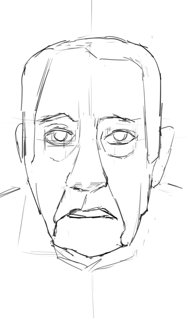 (続き)空間を捉えれば複雑なパターンでも把握できる。人物像も同様で、人物の目鼻立ちを描いてみよう。シルエットからアプローチしても良いし、コントラストがある箇所をチェックしても良い。顔の輪郭線、顎の位置、曲率をチェック。首と服の間には影がある。目鼻立ちを確認。眉毛の位置を描いて中心は左にズレている。目尻のシワ、目の位置。髪の毛の位置と耳の位置、口の位置。一度に正確に描くよりも分割して描いてその後にチェックすると良い。このように対象を正確に観察する方法を学ぶと皆さんの絵の描き方に一つのスキルがプラスされる。全体的に見て、印象を見て、部分を見る。それらのスキルを駆使して相互補完的な描き方ができるのだ。