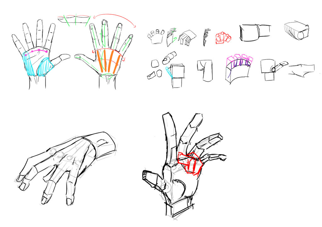 実践。3つ手のポーズを描く。手のひらや手の甲を描く時はアーチ型で流れる。最初に立方体を描く。大まかにそこからボリューム(指)をつなげる。中指を先にチェック。中指の中手骨の位置を描いたら小指。薬指と人差し指を描いて指の比率を整えよう。指は曲げる時に関節を別々に動かす。指の比率を意識しながらかこう。指の肉をつけたら水かき。各関節は並行のラインになる。面も短縮されて徐々に多く見えるようになる。最後の関節の半分ほどが爪。手首の骨の頭、手の甲の面。親指は手首の断面を考えて骨のラインを取る。親指の位置を予想しながら仕上げる。