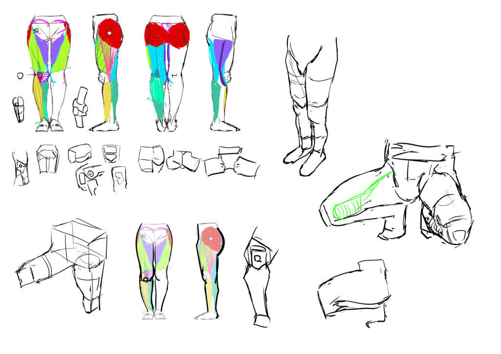 写真の分析。①膝蓋骨の空間。内と外のラインの違い。反対側のふくらはぎのライン。このような特徴を考えよう。②太ももの外側が下がって内側が下がる。膝は腓腹筋が出ている。尻のライン。③大腿四頭筋のライン。膝のボリュームと収縮。少し出ているところが長趾伸筋。④膝がくぼんでから出て言うr。大腿四頭筋の角度。膝蓋骨が突出して隠された部分が見えている。被覆部の確認。⑤上から見ると断面を意識しよう。太ももの内側、膝の骨のボリュームが六面体に見える。上から見ると被覆部は高い位置から始まる。⑥骨盤のランドマーク。突出した部分。前に出て、脚のラインが下がっている。これは重力によって変化している(脚を横にしている)。⑦短縮がかかっている。太ももが外側に上がって膝。ふくらはぎが断面を隠す。足首は横に長い。⑧腓腹筋。大腿四頭筋の流れ。ヒザの空間。内側のボリューム。⑨太もも、膝のライン。後ろ側の屈筋のボリューム、膝裏側の水平な区間。そこからのふくらはぎ。脚のライン、シルエットの確認。⑩膝蓋骨から脛骨粗面。外側の腓骨と大腿薄筋がくっつく。⑪膝の形。大腿四頭筋、膝の骨。膝蓋骨があり、大腿骨と脛骨粗面が内側に入って出て内側に入る。形を目で見えるまま描くのではなく、どこが上にあってどこが下なのか解釈しよう。(終了)